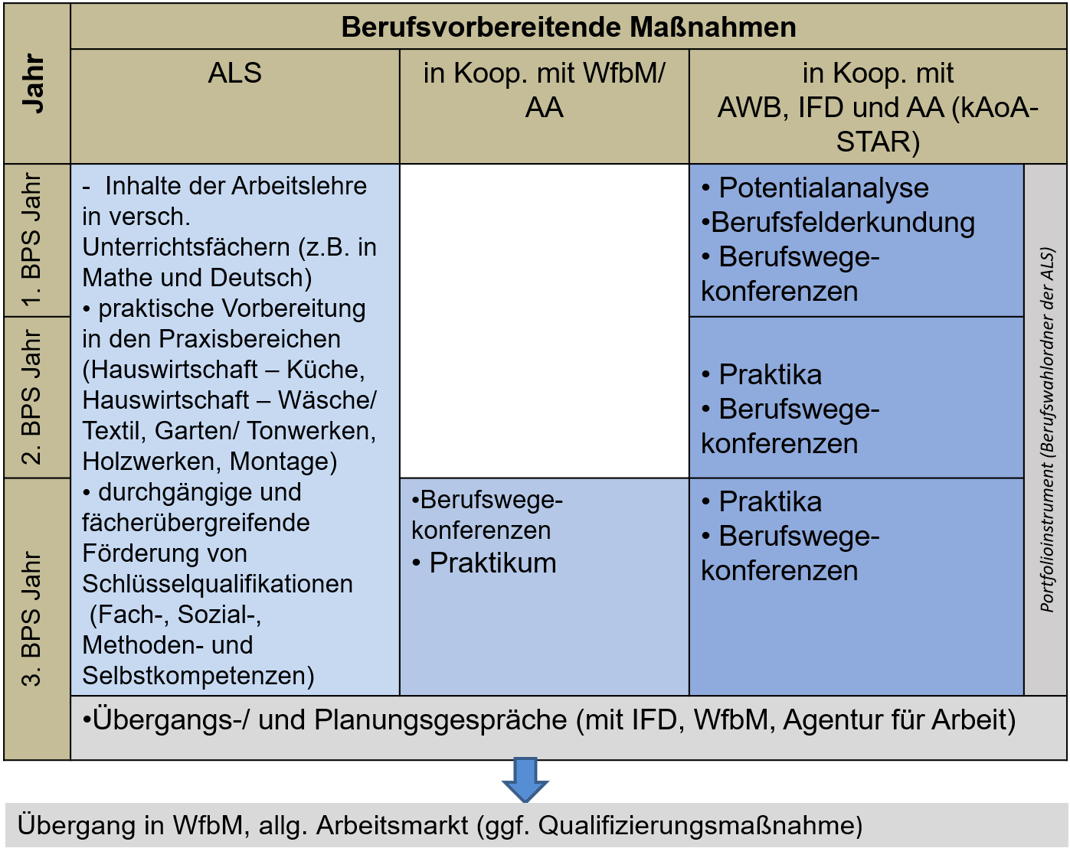 Im letzten Schulbesuchsjahr findet für alle Schüler die sogenannte Rehaberatung statt. Hier wird der konkrete, individuelle Ablauf des Übergangs in das Berufsleben besprochen. Möglich ist hier zum Beispiel der Übergang in den Berufsbildungsbereich einer WfbM oder in eine Maßnahme der Agentur für Arbeit mit dem Ziel, den Schüler für einen Arbeitsplatz auf dem allgemeinen Arbeitsmarkt zu qualifizieren. Hier sind in erster Linie die Unterstützte Beschäftigung (UB) oder die berufsvorbereitende Bildungsmaßnahme (BvB) zu nennen.