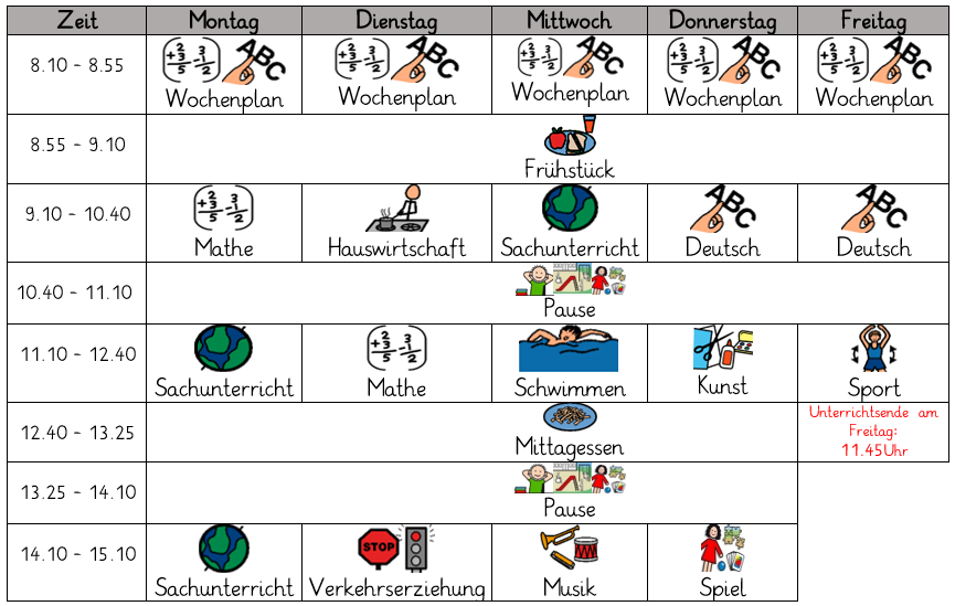 In der Vor-/Unterstufe befinden sich SuS im ersten bis fünften Schulbesuchsjahr in einer altersgemischten Klasse. In der Regel liegt ein umfassender Unterstützungsbedarf bei den SuS in allen Lern- und Entwicklungsbereichen vor. Das spielerische, abwechslungsreiche und ganzheitliche Lernen steht in der Vor-/Unterstufe im Vordergrund. Eine klare Strukturierung und Rhythmisierung des Schulalltages hilft den SuS, sich in Schule einzufinden. Ein Beispiel ist der klar strukturierte Stundenplan.